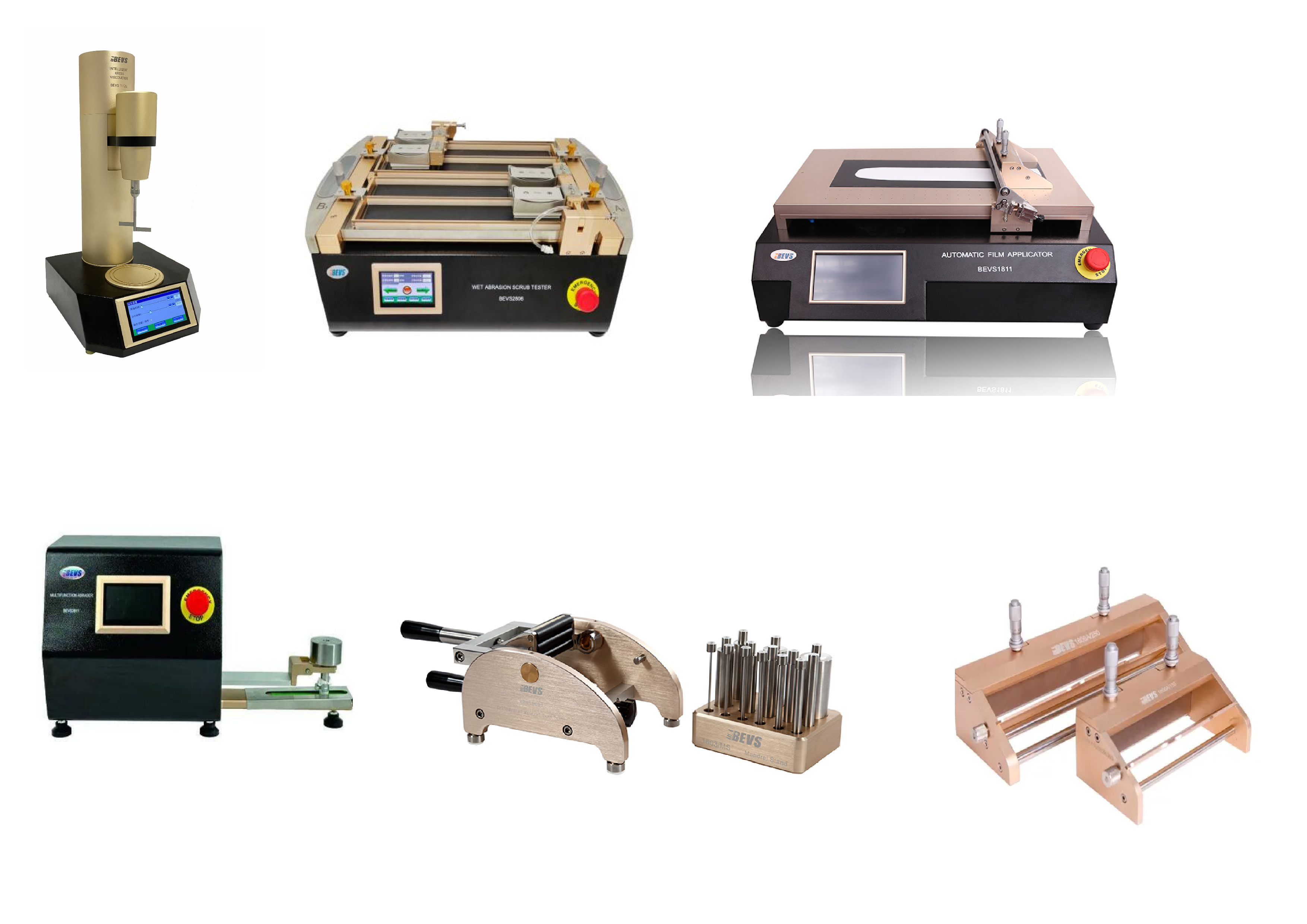 Dụng cụ tạo màng phủ: Bevs cung cấp các loại thanh gạt sơn, thiết bị tạo màng thủ công và tự động để kiểm soát độ dày màng sơn. Ngoài ra, còn có các bảng kiểm tra khả năng che phủ giúp đánh giá hiệu quả bao phủ màu trên bề mặt vật liệu.